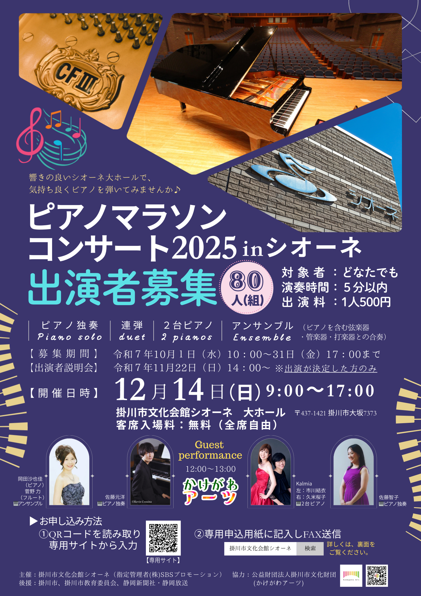 響きの良いシオーネの大ホール、お客さまが鑑賞する中でフルコンサートピアノYAMAHA CFⅢSを弾いてみませんか♪1人(組)5分以内で、リレーのようにピアノをバトンしていきます♪詳しい募集内容はこちらまた、公益財団法人 掛川市文化財団の「かけがわアーツ」より、掛川市内外で活躍している4組のピアノ奏者も出演します!◇◆◇Guest Performance◇◆◇◆◇◆◆◇◆