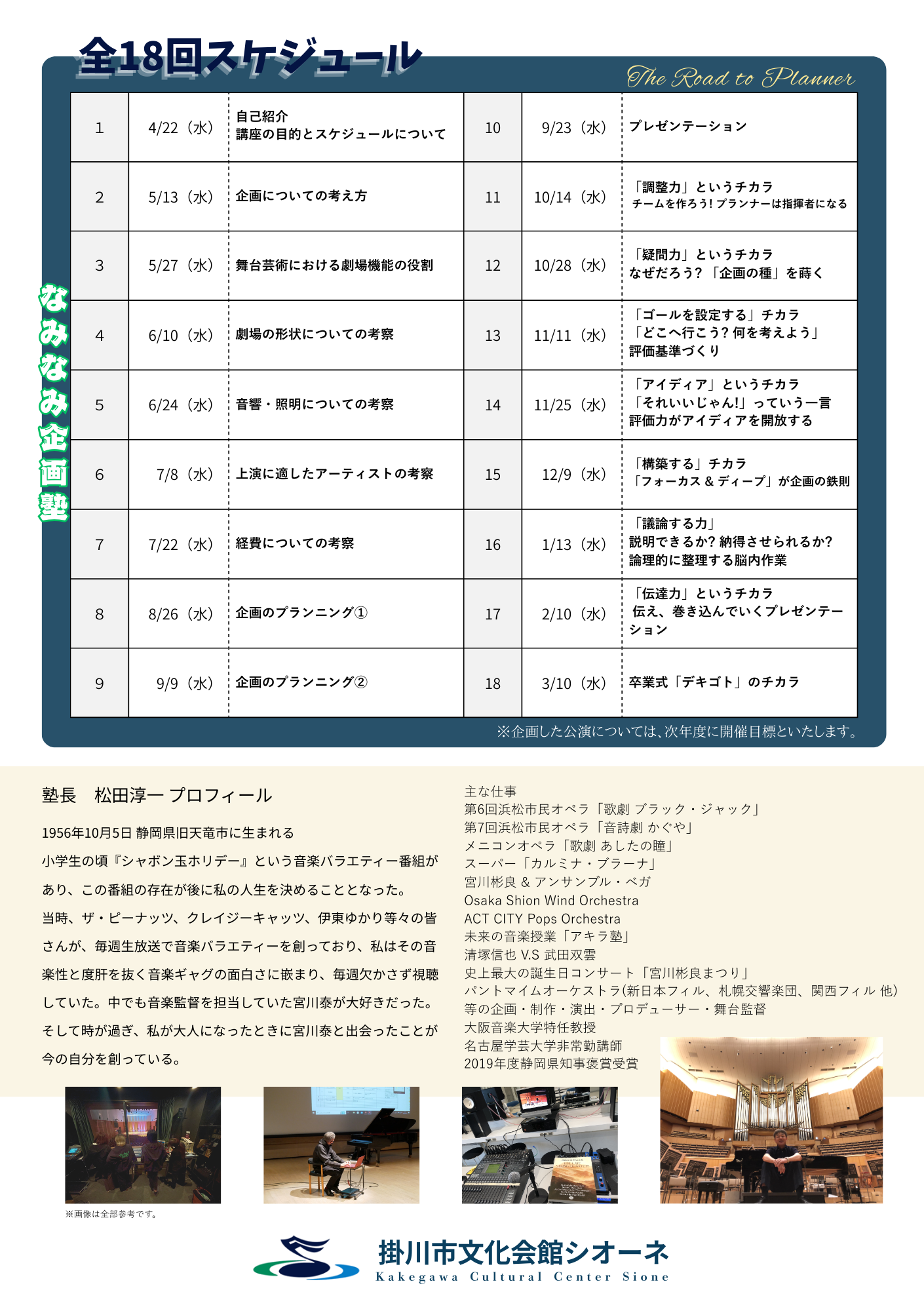 音楽ホールを持つ文化施設として、オペラ・バレエ・ミュージカル・コンサート等の舞台芸術の世界で必要とされる企画と制作について、広く深く具体的に学べる講座を開講します。